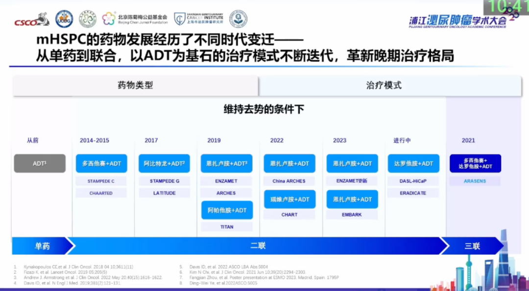 过去20年,mHSPC的治疗经历了从单一雄激素剥夺治疗(ADT)到ADT联合治疗的重大转变。从STAMPEDE、LATITUDE等一系列研究证实ADT联合化疗或ADT联合新型内分泌治疗的显著获益,再到ADT联合新型内分泌和多西他赛化疗的三联方案,mHSPC治疗已进入多药联合方案的崭新阶段。