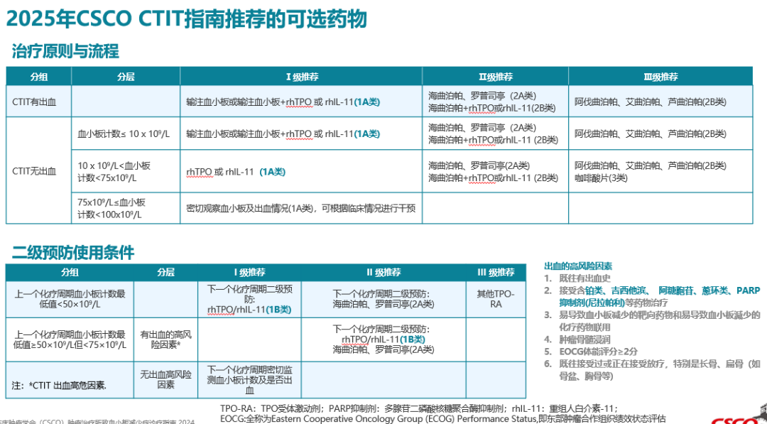 综上,应根据患者治疗阶段、血小板水平和出血风险个体化制定预防与治疗策略;优先推荐rhTPO,因其机制全面、起效快、安全性好,是目前中国CTIT管理中最常用的药物之一;临床应重视肿瘤科、血液科、药学等多学科合作,优化CTIT管理流程。