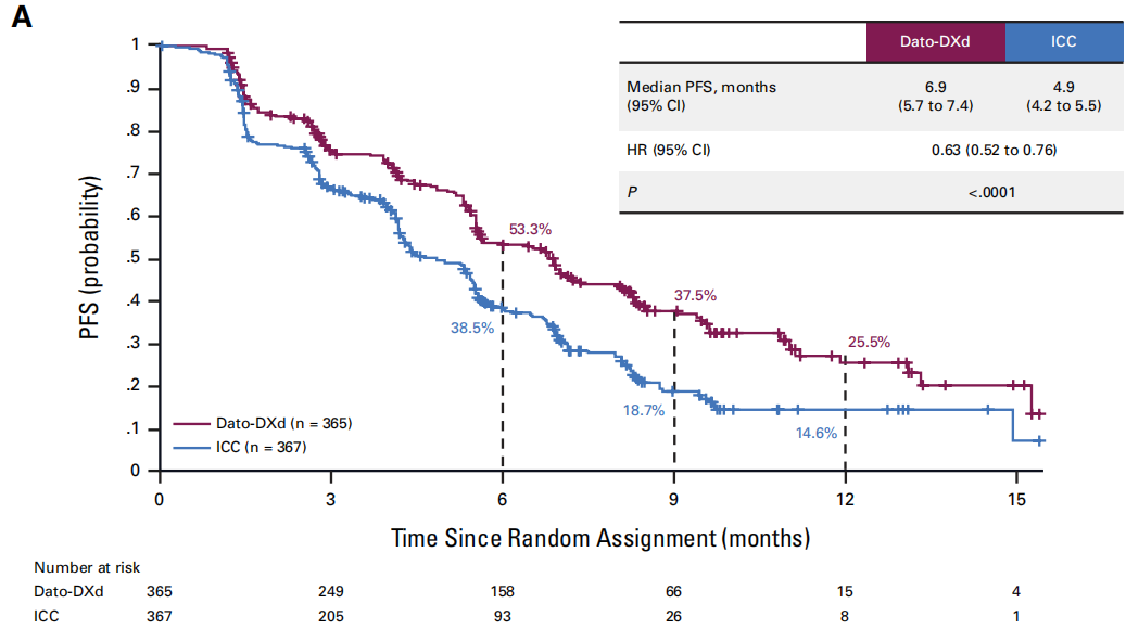 研究共纳入包括中国在内20个国家166家中心的1003例患者,最终Dato-DXd组365例、ICC组367例纳入分析,约80%的患者为CDK4/6i经治。结果显示:Dato-DXd vs ICC,BICR评估的mPFS为6.9个月vs 4.9个月(HR,0.63[95%CI:0.52-0.76];P<0.0001),降低了37%的疾病进展或死亡风险,各亚组与全人群获益一致,均能从Dato-DXd治疗中获益。相较于ICC组,Dato-DXd组缓解率更高(ORR为36%vs 23%),为患者带来了很好的近期获益。mOS方面,Dato-DXd组19.1个月vs化疗组17.5个月(校正HR 0.86;95%CI:0.70-1.06),期待更长期的随访结果。