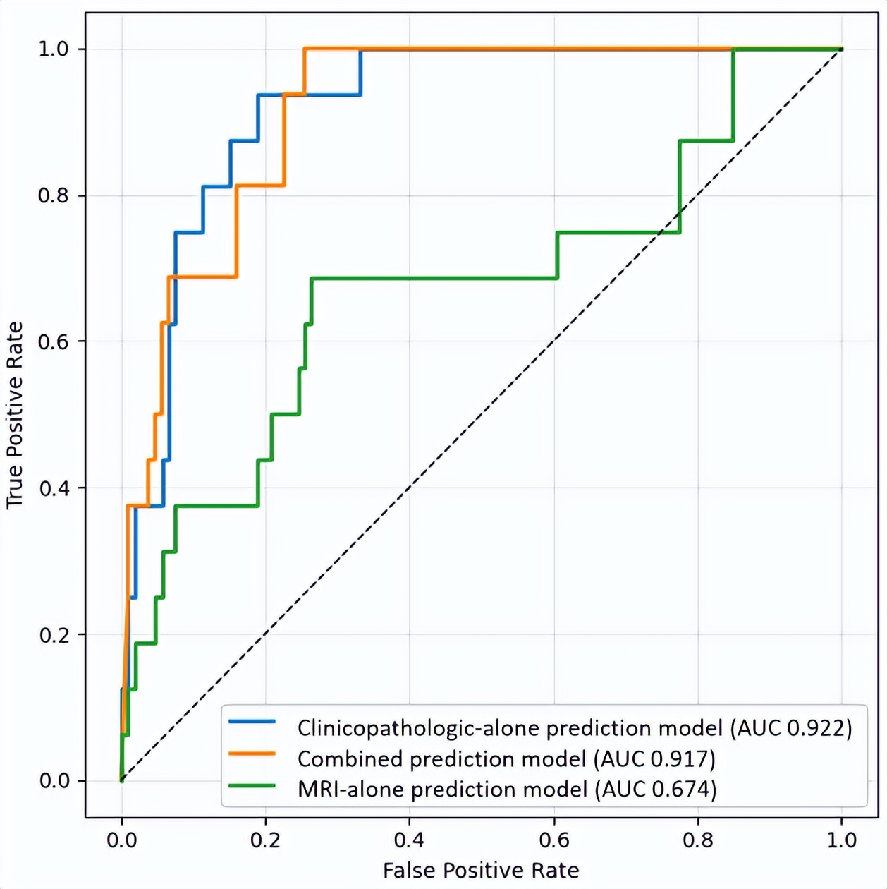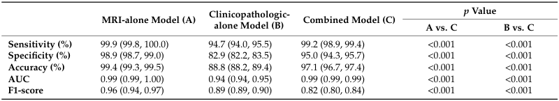 与MRI模型和临床病理模型相比,组合模型的所有性能改进均具有统计学意义(组间比较P<0.001)。