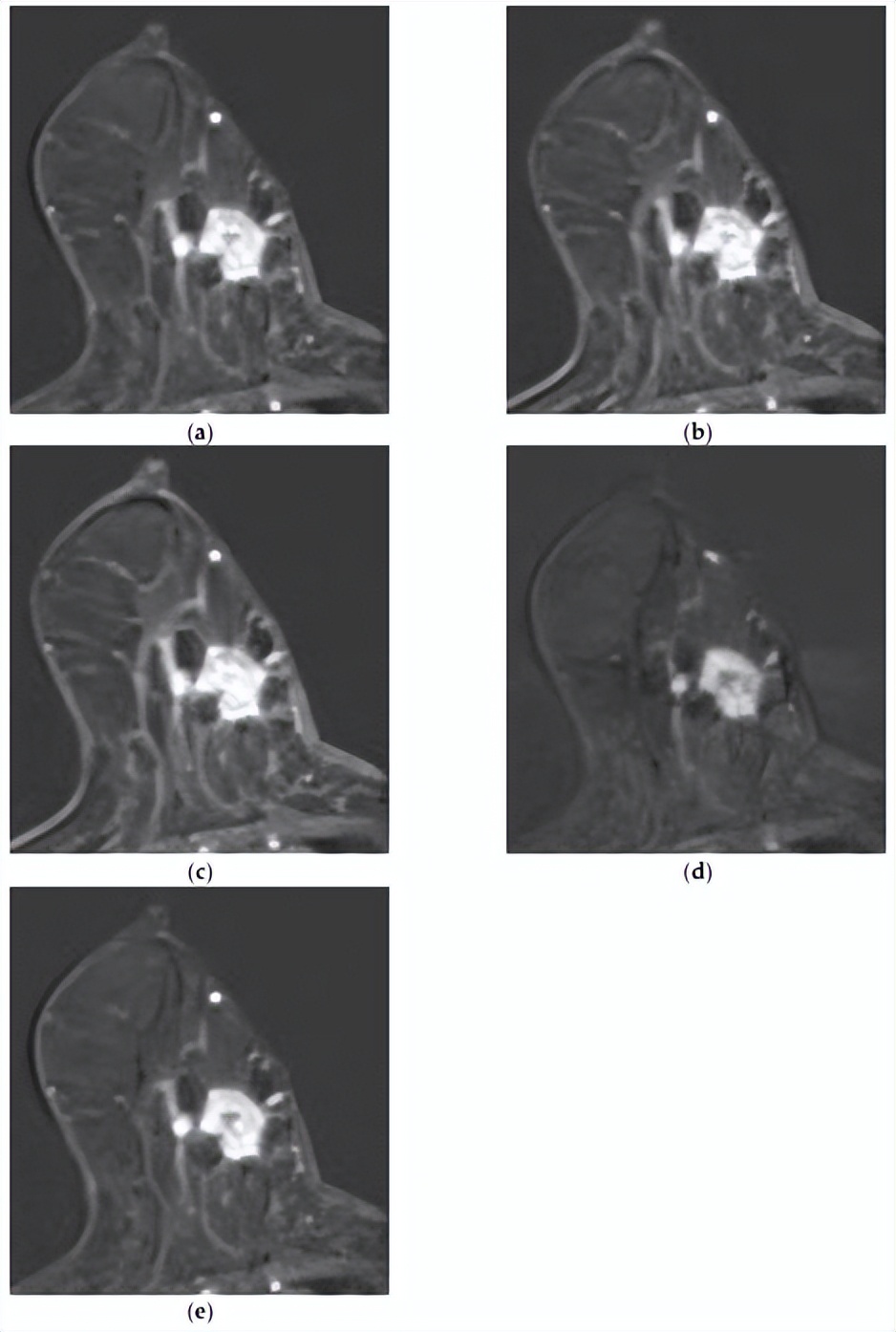 [MRI和组合模型均正确预测了复发。一名50岁女性,具有不均匀致密的纤维腺体组织和中度背景实质强化。注射对比剂后(a)1分钟、(b)2分钟、(c)3分钟、(d)4分钟和(e)5分钟的轴向增强T1加权MR图像显示,左乳房12点位置有一个1.8×1.6厘米的不规则形状、边缘有毛刺、边缘增强的肿块。在主要病变后方可见另一个8毫米增强肿块,侧面还有另外两个8毫米增强肿块,它们似乎相互连接。虽然图像中未显示,但上内象限存在另一个增强病变,证实了多中心疾病。两种模型均成功预测了该复发病例。]