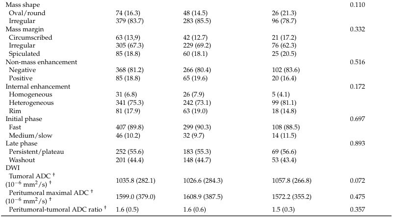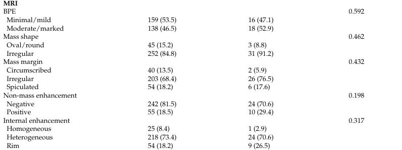 MRI特征方面,复发组与未复发组的弥散加权成像(DWI)特征(ADC值等)差异均无统计学意义,背景实质强化(BPE)、肿块形态、肿块边缘、非肿块强化(NME)、内部强化、早期及晚期动力学曲线类型在两组间差异均无统计学意义。