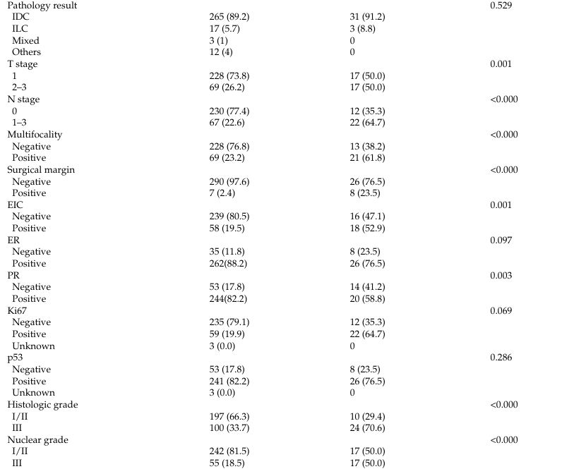 在训练队列的331例符合条件的患者中,34例出现复发,297例未出现复发。在临床病理变量中,复发患者的T分期(26.2%vs.50.0%,P=0.001)和N分期(22.6%vs.64.7%,P<0.000)高于未出现复发的患者。此外,复发组的多病灶肿瘤发生率(23.2%vs.61.8%,P<0.000)显著高于未出现复发的患者。并且,组织学特征为III级(33.7%vs.70.6%,P<0.000)和核特征为3级(18.5%vs.50.0%,P<0.000)的患者复发率更高。复发患者的孕激素受体(PR)阴性率也高于未复发患者(41.2%vs.17.8%,P=0.003)。相比之下,两组间雌激素受体(ER)状态或Ki-67指数无统计学显著差异。