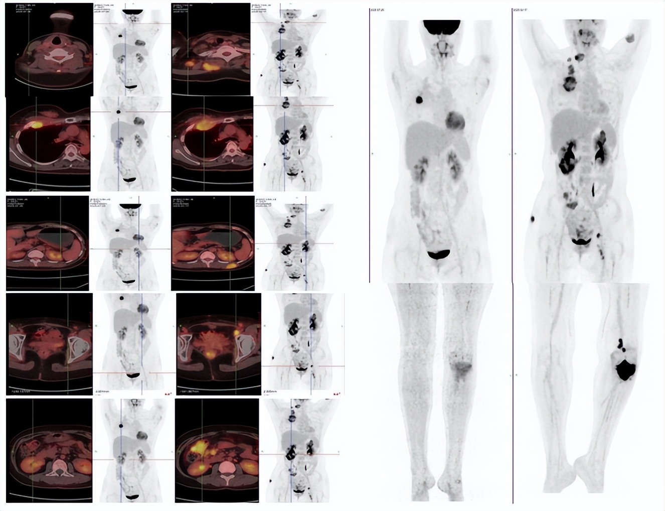 2024-10完善PET-CT提示肿瘤全面进展(新增胸1水平右侧及胸12水平左侧竖脊肌转移,右侧髋部皮下转移,左侧胫骨转移,结肠肝区旁可疑转移)。因左侧胫骨疼痛明显,当地医院行左侧胫骨局部姑息性放疗(3Gy*10f)。
