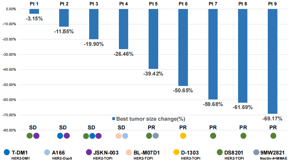 其余6例患者(既往接受过非DS-8201的ADC药物或多种ADC治疗),2例达到部分缓解(ORR=33%),4例疾病稳定(SD),且6例患者均显示肿瘤缩小(DCR=100%)。