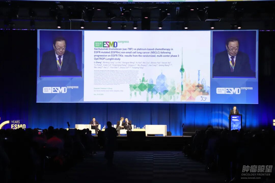 编者按:EGFR突变是我国非小细胞肺癌(NSCLC)最常见的驱动基因突变,携带该突变的患者群体庞大,尽管已有酪氨酸激酶抑制剂(TKI)为主的靶向治疗药物,但发生耐药后特别是对第三代TKI耐药的患者仍缺少有效治疗选择,为有效改善患者长期生存,满足我国患者的迫切治疗需求,仍需更有效的创新药物驰援二线治疗。在刚刚落幕的2025欧洲肿瘤内科学会(ESMO)年会上,中国创新TROP2抗体偶联药物(ADC)芦康沙妥珠单抗的又一项关键临床III期研究OptiTROP-Lung04结果报告入选年会主席专场,并在《新英格兰医学杂志》(NEJM)同步刊发,芦康沙妥珠单抗取得同时显著延长患者无进展生存期(PFS)及总生存期(OS)的双阳性结果,临床意义得到与会专家的高度认可。《肿瘤瞭望》就此特邀OptiTROP-Lung04研究主要研究者、中山大学肿瘤防治中心张力教授,在ESMO年会现场深入解读研究数据,分析芦康沙妥珠单抗在EGFR突变NSCLC治疗中的临床价值。