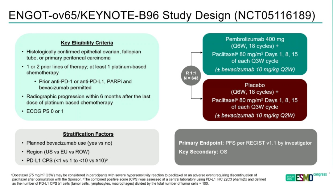 III期ENGOT-ov65/KEYNOTE-B96试验纳入643名曾接受过1或2线治疗(其中至少包括1种铂类化疗)的上皮性卵巢癌、输卵管癌或原发性腹膜癌患者,随机分配至帕博利珠单抗组(n=322)或安慰剂组(n=321)。治疗方案为帕博利珠单抗(400 mg,每6周一次,共18个周期)或安慰剂;所有患者均接受紫杉醇80 mg/m2±贝伐珠单抗(10 mg/kg,每2周一次)。86.0%的患者为高级别浆液性组织学类型,7.8%为透明细胞组织学类型。约四分之三(73.3%)的患者在基线时使用了贝伐珠单抗。主要终点是研究者根据RECIST v1.1评估的无进展生存(PFS)。