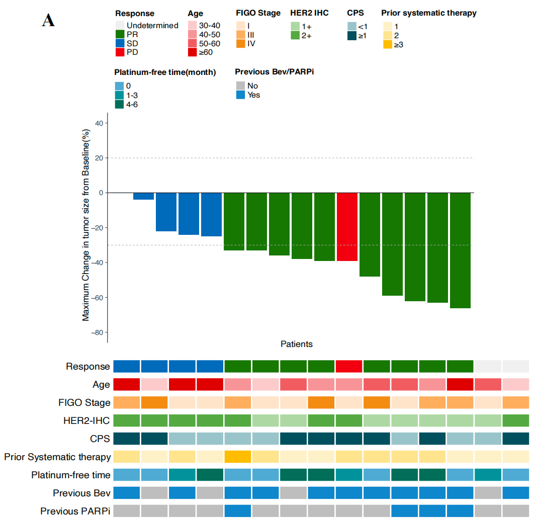 卡度尼利单抗作为本研究方案的核心药物,其PD-1/CTLA-4双靶点协同机制充分释放了免疫治疗潜能。该药通过双通路免疫激活,实现了T细胞功能重塑与免疫微环境再平衡,从而在“热肿瘤”特征的OCCC中展现出抗肿瘤活性。其与维迪西妥单抗及贝伐珠单抗的联合应用,进一步实现了“1+1+1>3”的多机制协同增效——既增强了免疫效应,又改善了肿瘤微环境通透性,为多维精准免疫联合策略提供了新思路。