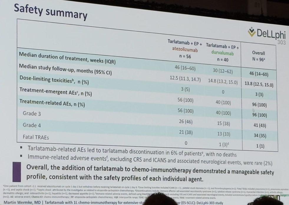DeLLphi-303是一项Ib期、多中心、开放标签、多队列研究,旨在评估Tarlatamab联合标准化疗+免疫治疗的安全性、药代动力学、药效学及初步活性。其中队列5、6和8纳入4-6周期标准化疗+免疫后未进展患者,给予Tarlatamab联合免疫检查点抑制剂阿替利珠单抗或度伐利尤单抗维持治疗。结果显示自维持治疗起中位PFS为5.6月,中位OS为25.3月[2],提示Tarlatamab一线治疗的巨大潜力。此次ESMO会议公布了队列2、4和7的初步研究结果,主要探索Tarlatamab联合标准化疗+免疫后,Tarlatamab+阿替利珠单抗或度伐利尤单抗维持治疗的安全性及有效性。