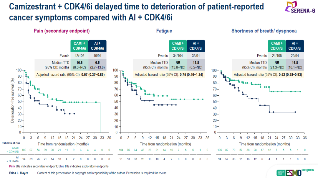 图1.SERENA-6研究中Camizestrant延缓患者疼痛、疲劳和呼吸困难恶化的疗效