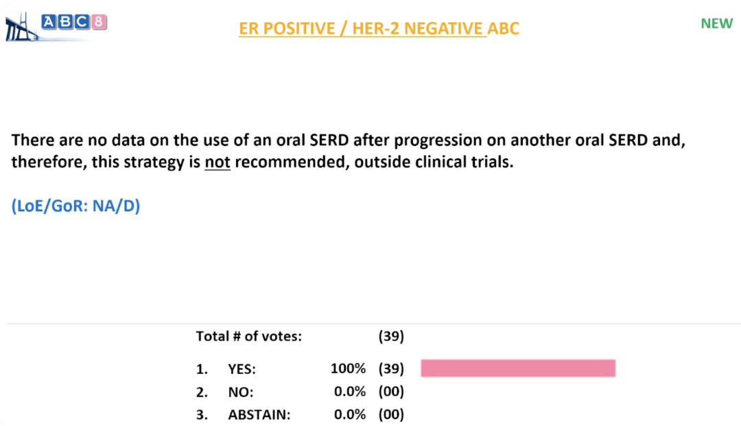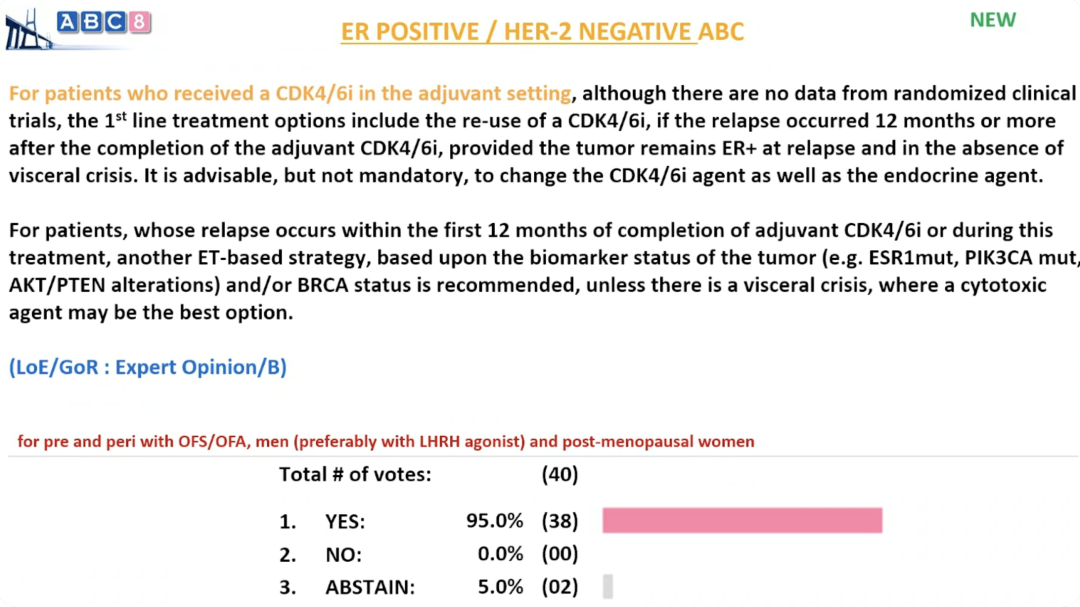 编者按:第八届晚期乳腺癌国际共识会议(ABC8)于当地时间2025年11月6~8日在葡萄牙里斯本举行。ABC共识指南是晚期乳腺癌领域首屈一指的国际性权威指南,汇聚了全球晚期乳腺癌领域的“意见领袖”级别专家,基于最新的循证医学证据对前沿和热议话题进行投票以达成共识,为全球晚期乳腺癌临床实践的革新和规范提供指导意见。肿瘤瞭望对ER+/HER2-晚期乳腺癌诊疗章节的专家意见和投票结果整理如下。
