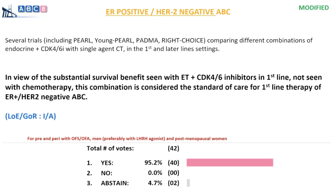 第八届晚期乳腺癌国际共识会议(ABC8)于当地时间2025年11月6~8日在葡萄牙里斯本举行。ABC共识指南是晚期乳腺癌领域首屈一指的国际性权威指南,汇聚了全球晚期乳腺癌领域的“意见领袖”级别专家,基于最新的循证医学证据对前沿和热议话题进行投票以达成共识,为全球晚期乳腺癌临床实践的革新和规范提供指导意见。肿瘤瞭望对ER+/HER2-晚期乳腺癌诊疗章节的专家意见和投票结果整理如下。