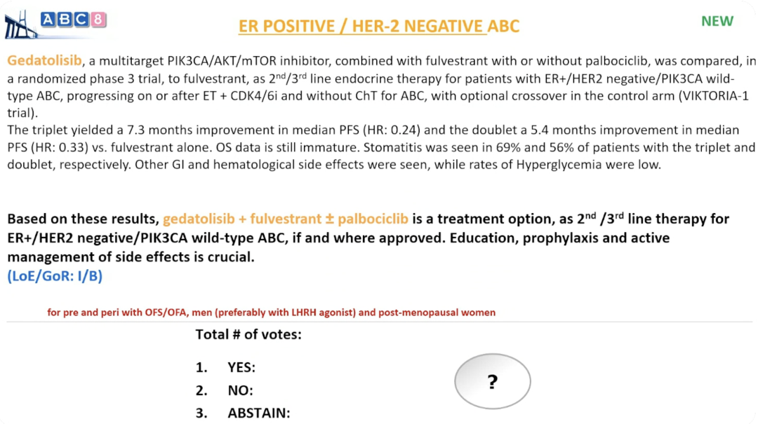 在一项随机III期试验(VIKTORIA-1试验)中,对Gedatolisib(一种多靶点PIK3CA/AKT/mTOR抑制剂)联合氟维司群,并选择性地联合或不联合哌柏西利,与单用氟维司群进行了比较。该试验针对PIK3CA野生型的ER+/HER2-晚期乳腺癌患者,用于其二线/三线内分泌治疗,这些患者均在既往内分泌治疗+CDK4/6i期间或之后进展,且未接受过针对晚期乳腺癌的化疗,试验允许对照组交叉换组。
