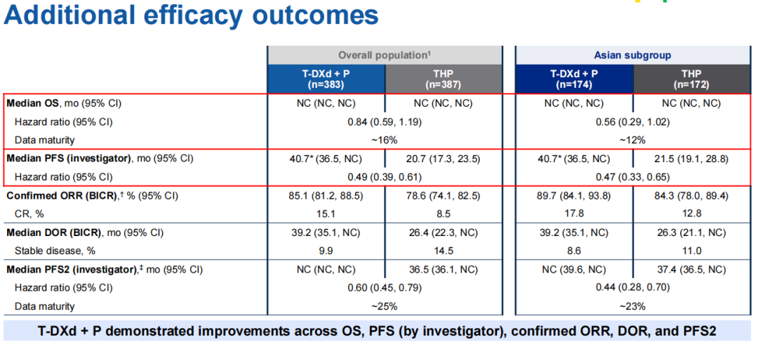 值得注意的是,T-DXd+P方案治疗亚洲患者的客观缓解率(ORR)为89.7%,其中17.8%为CR,高于THP组的84.3%和12.8%,且中位缓解持续时间(mDoR)为39.2个月,较THP组数值上延长超过1年(26.3个月);而在中国人群中,T-DXd+P组的以上各项数据更为出色,例如ORR为95.5%,CR率达21.6%。综合PFS和ORR数据,T-DXd+P方案在亚洲人群和我国患者中都展现了出色疗效,我对该方案成为一线治疗新标准有充分的信心。