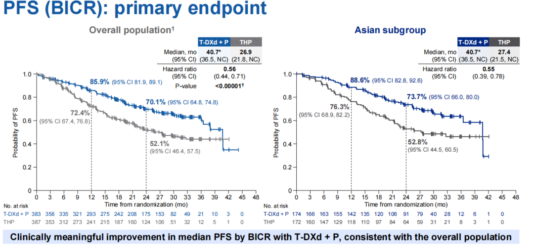 分析数据显示,T-DXd+P组亚洲患者由BICR评估的mPFS为40.7个月,THP组则为27.4个月(HR 0.55,95%CI:0.39-0.78),两组24个月PFS率为73.7%和52.8%,T-DXd+P方案较THP方案治疗显著延长了患者PFS,获益幅度与此前报告的研究全球人群数据一致,由研究者评估的PFS也与BICR评估呈相同趋势[1]。上述数据也与2025年中国临床肿瘤学会(CSCO)学术年会期间报告的研究中国人群数据基本相同,即T-DXd+P组中国患者mPFS尚未达到,但24个月PFS率为75.3%(由BICR评估),高于THP组的54.0%。