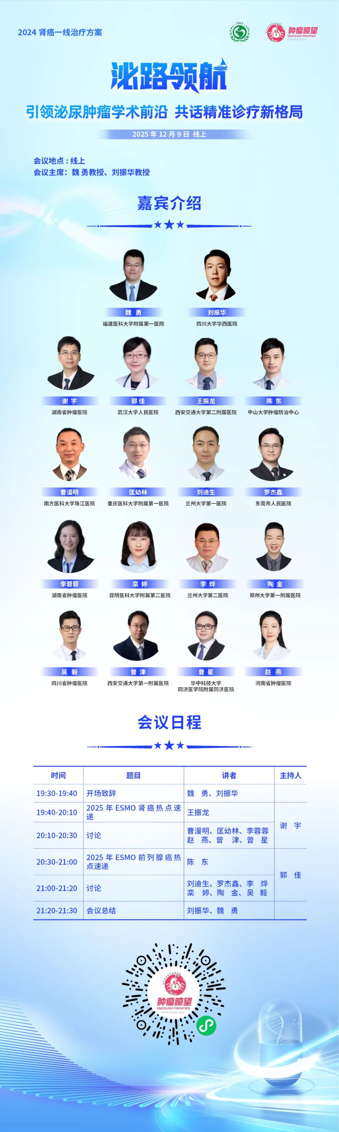 12月9日的会议将重点探讨2025 ESMO泌尿肿瘤精粹。会议由福建医科大学附属第一医院魏勇教授和四川大学华西医院刘振华教授共同担任主席,湖南省肿瘤医院谢宇教授和武汉大学人民医院郭佳教授担任主持。西安交通大学第二附属医院王振龙教授中山大学肿瘤防治中心陈东教授分别报告《2025年ESMO肾癌热点速递》和《2025年ESMO前列腺癌热点速递》,两场主题演讲后均设有深度讨论环节,邀请十余位领域内知名专家展开思维碰撞,共话临床实践。