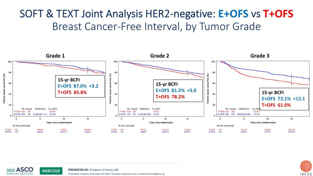 2025ASCO大会上汇报的SOFT&TEXT研究中位随访15年结果,确认了“AI+OFS”方案为绝经前HR+早期乳腺癌患者带来的持久获益。依西美坦+OFS相较于TAM+OFS持续改善疗效,15年DFS率分别为74.9%vs 71.3%(HR=0.82)[11]。研究进一步明确了可从AI+OFS方案中更高获益的患者特征,主要包括: