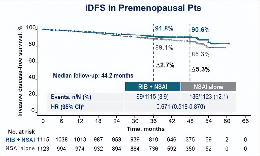 绝经前人群的年龄亚组分析显示,无论是<40岁还是≥40岁的患者,联合治疗均带来一致获益。其中,<40岁的非常年轻患者获益幅度更为突出,其4年iDFS与DDFS的绝对提升分别达到6.3%和7.0%,显示出强大的远期复发控制潜力。该方案在此类高复发风险人群中耐受性良好,停药率低,有助于维持患者生活质量[13]