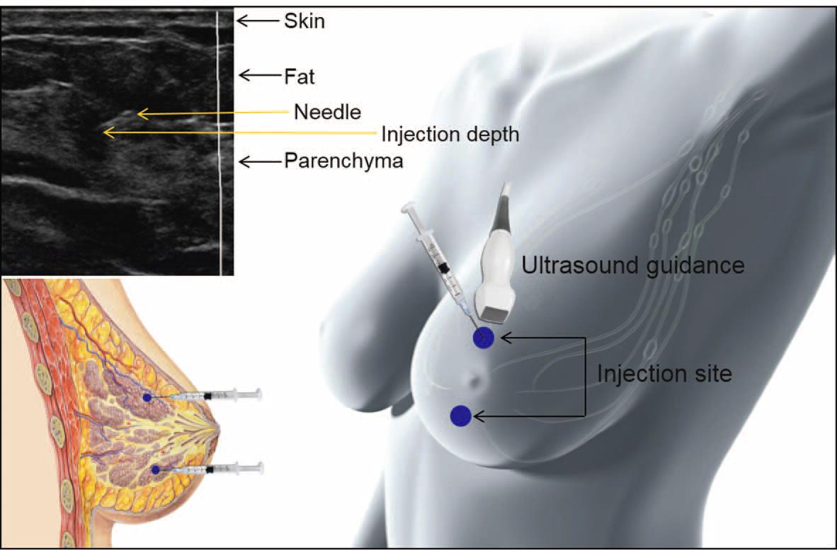 为乳腺癌患者提供更为准确的个体化治疗策略,近年来备受关注。随着前哨淋巴结(SLN)活检术的发展,内乳区前哨淋巴结(IMSLN)活检术可望成为评估IMLN状况的微创诊断技术。但是,应用传统注射技术所达到的IMSLN显像率很低(平均13%),成为限制IMSLN活检术广泛开展的瓶颈。本课题组尝试在超声引导下将核素示踪剂注入乳晕周边区6点和12点位的乳腺腺体层内,同时通过增加注射体积提高局部张力,获得了较高的IMSLN显像率(71.1%),并将其总结为“新型注射技术”。