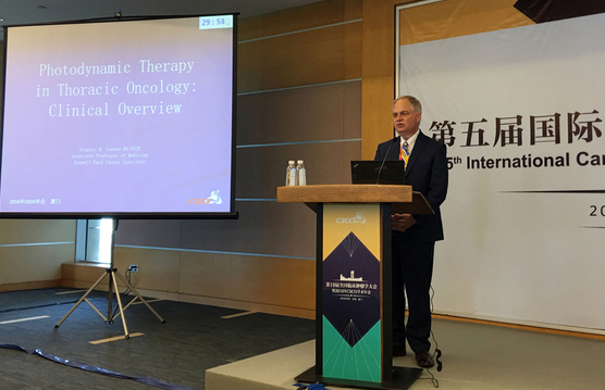2016年9月22日,第五届国际肿瘤光动力治疗高峰论坛在CSCO年会期间举办。美国Rosswell Park癌症研究中心的Dr.Gregory Loewen作报告“PDT在胸科肿瘤的临床应用(Photodynamic Therapy in Thoracic Oncology: Clinical Overview)。本次会议由中国临床肿瘤学会副理事长罗荣城教授和CSCO肿瘤光动力治疗专家委员会主任委员李黎波教授主持。