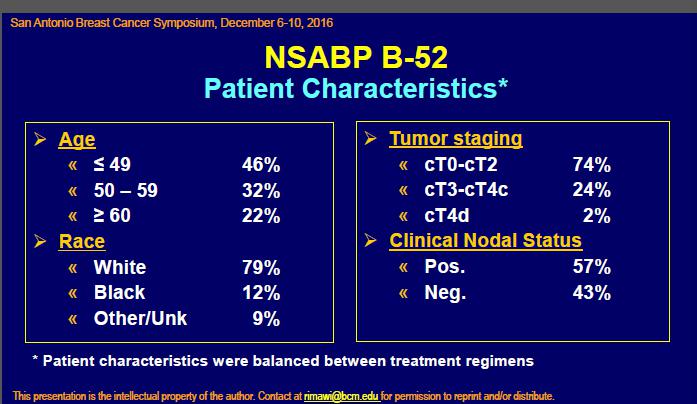 胡夕春教授:美国的NSABP-B52临床试验,研究人群是三阳性的患者和刚才的临床试验适用人群不一样,是三阳或者二阳的是激素受体阳性或者HER2受体阳性的患者的临床试验。下面有请张教授为我们讲讲这个临床试验。