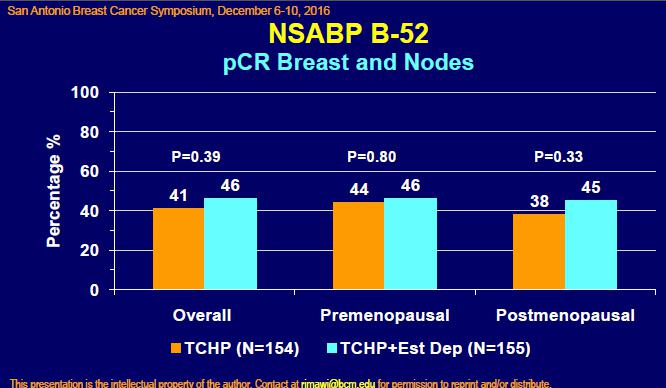 张瑾教授:NSABP-B52临床试验也是一个新辅助治疗的临床研究,它是在以往的传统的治疗方案基础上联合了一个内分泌治疗来针对ER阳性和HER2阳性的患者。NSABP-B52临床试验的设计中TCHP方案是在新辅助化疗中有过疗效验证的,也是疗效比较好的一个方案。对于这样一组三阳性的患者希望能够在这方案的基础上,靶向、化疗的基础上再联合内分泌,这是该试验验设计的初衷,也就是说化疗、靶内、内分泌的联合能不能在原有的化疗、靶向的基础上获得一个更好的pCR。在这次大会当中这个临床试验公布了结果,并没有达到大家预期的三种不同的作用机制、不同的治疗药物联合能够增效,结果却并不理想。但有疗效提高的pCR的一个趋势,特别是在残留病灶上是有一点优势的,虽然最后P值没有得到一个显著性的差异。同样也说明乳腺癌并不是说有HER2阳性,ER阳性这样的指标就能够明确地反映三阳性乳腺癌的全貌和它的异质性的存在,也不是说对于这样靶点的掌控就完全能够提高pCR率。该试验提示,乳腺癌的异质性和它本身需要来进一步揭示以找到其中可能有效的一部分人群,对于一部分人群需要找到它的新靶点和新的治疗方案,所以也存在个体化的选择,总之,这样的一个试验结果对临床实践的指导意义还是非常大的。