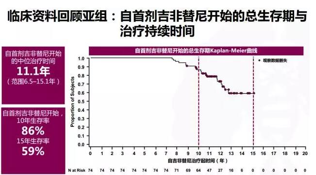 患者接受吉非替尼的中位治疗时间为11.1年(6.5-15.1年)。从患者的服药情况来看,长期的吉非替尼治疗是可以耐受的,其中仅5%的患者因为药物相关的AE停药。从开始服药吉非替尼治疗之时开始计算,患者的10年生存率为86%,15年生存率为59%。