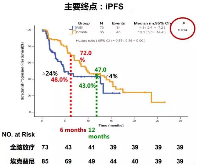 吴一龙教授在2016WCLC会议的主席论坛上报告了BRAIN研究结果,BRAIN研究是首个对EGFR TKI与全脑放疗比较的III期临床试验。BRAIN研究结果显示,WBRT组和埃克替尼组的颅内无进展生存(iPFS)分别为4.8个月 vs. 10.0个月,P=0.014。WBRT组和埃克替尼组6个月iPFS率分别为48.0%和72.0%,埃克替尼组提高了24%,12个月iPFS率分别为43.0%和47.0%,埃克替尼组提高了4%。