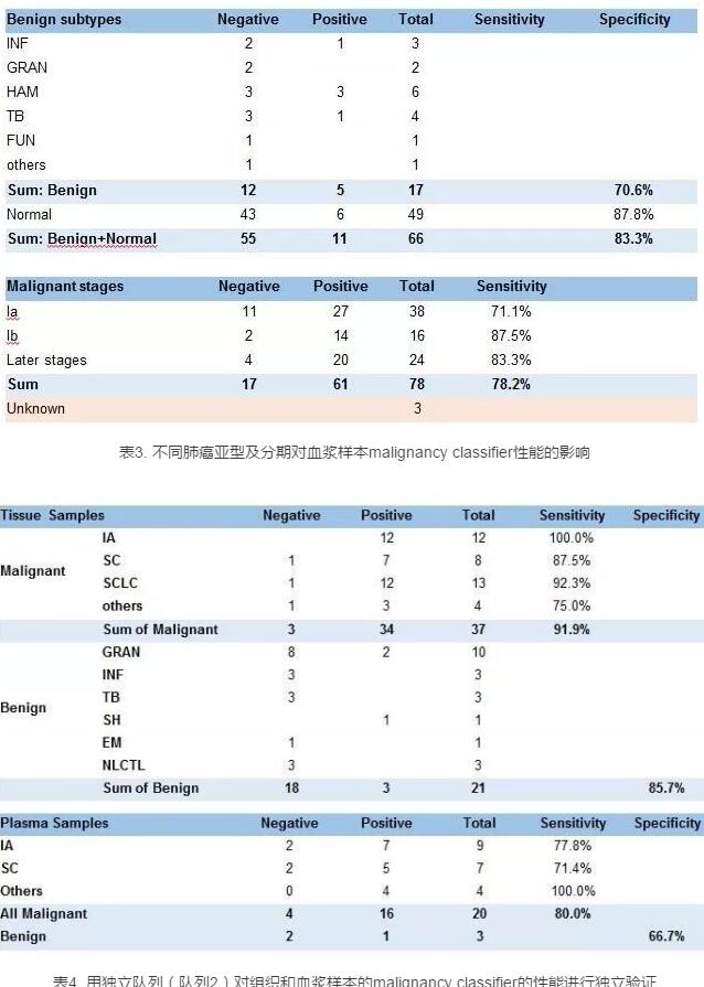 为了进一步验证该诊断模型的临床应用可行性,我们在其他研究中心进行了独立验证,独立验证实验共入组58例肺孤立结节组织样本,整体灵敏度89.2%,肺腺癌灵敏度达到100%,整体特异性85.7%。同时入组23例血液样本,20例肺癌患者外周血和3例良性结节患者外周血,灵敏度和特异性分别达到80%(16/20)和66.7%(2/3)。