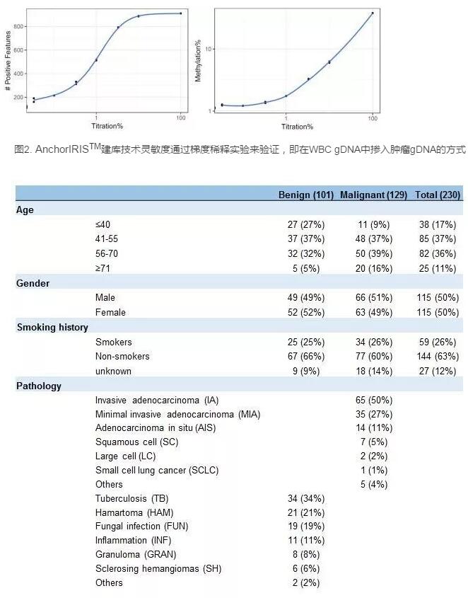 我们首先利用DNA甲基化高通量测序和深度数据分析,在组织样本层面寻找区别肺癌和良性结节的特异性DNA甲基化模式。然后,在去除血浆中高背景甲基化模式后对肺孤立结节血液样本进行鉴别诊断。值得注意的是,鉴于血浆中ctDNA含量很低,我们开发了一种超灵敏的ctDNA甲基化建库技术(AnchorIRISTM),最低建库起始量低至1 ng血浆游离DNA(cfDNA)或1 ml血浆。