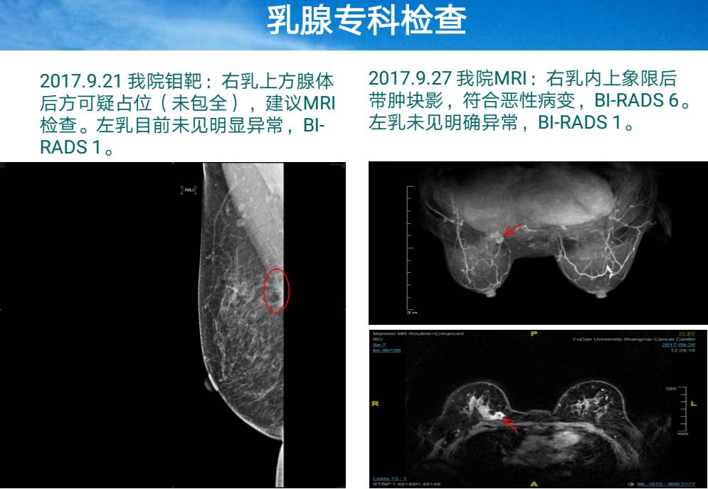 患者于2017.9.20参加了CMUP多学科讨论。CMUP团队首先对患者进行全面的体格检查,发现右侧胸壁乳腺上方扪及一个2cm肿块,边界不清,无触痛,质地硬。双锁骨上、双腋下(-)。妇科检查未见明显异常。