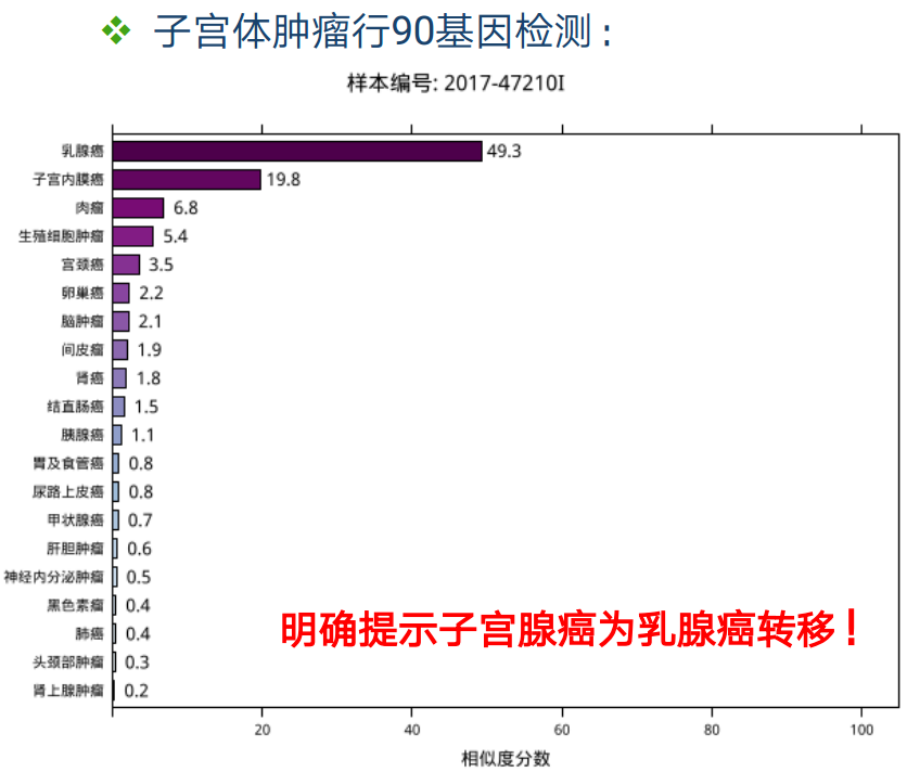 经过手术和术后病理检查,已明确这位患者是乳腺小叶癌转移至卵巢,但是否是乳腺小叶癌转移至子宫?对此高度怀疑,因为两者的免疫表型(ER/PR)不完全一致。因此对子宫体肿瘤行肿瘤组织起源基因检测(图7),检测结果明确提示子宫腺癌为乳腺癌转移!
