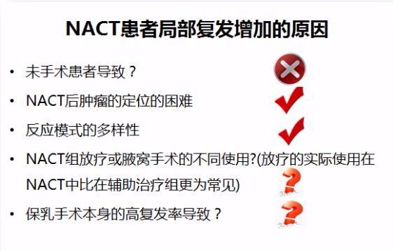 2007年的一篇荟萃分析提示新辅助化疗后全乳切除率下降,新辅助化疗和辅助化疗对局部复发没有影响,局部复发率在计划保乳的患者和降期后保乳的患者中也没有差异。但是2017年12月在线发表在lancet上的来自早期乳腺癌临床试验协作组(EBCTCG)的一篇荟萃分析则提出了不同的观点。