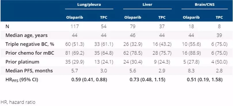 前者主要在OlympiAD基础上,评估BRCA1/2种系突变+/HER2-的转移性乳腺癌肺/胸膜转移,肝转移、脑/中枢神经系统转移等不同亚组的治疗效果。Olaparib组的客观缓解率明显优于化疗组;PFS和ORR结果与既往总体分析结果基本一致(表1)。