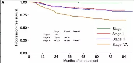 所有患者均接受增强同步放疗。放疗剂量为:原发肿瘤66~72 Gy,转移淋巴结64~70 Gy。对于I期患者只使用IMRT,而对于II至IVb期患者使用同步放化疗。 III/IV期的患者共1148例,其中有1081例(94.2%)接受了化疗,包括同步放化疗(CCRT)、诱导化疗及辅助化疗。化疗药物分别包括顺铂联合5-FU或紫杉醇(或二者皆有),每3周1次,进行2~3个周期。