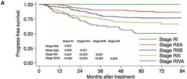 图2. 按照建议分期系统进行分期,各分期患者的PFS比较
