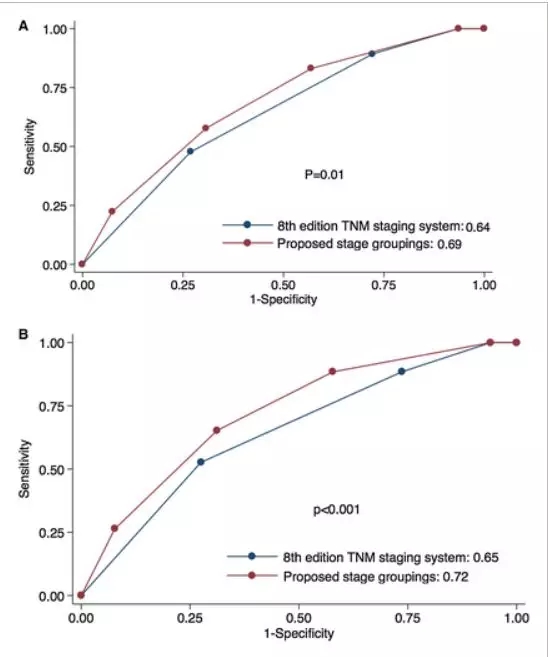 图3. TNM系统和建议分期系统对PFS及OS的ROC曲线