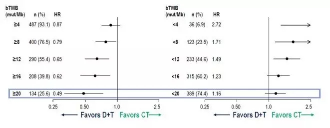 研究后续做了大量的探索性分析。2019 ASCO更新的是PD-L1 TC(cutoff=25%)与bTMB(cutoff=20mut/Mb)联合预测价值(摘要号 9016)。对于PD-L1 TC≥25%者,单药D相较于化疗,提高了OS,与bTMB无关。而对于bTMB≥20者,D+T相较于化疗,提高了OS,与PD-L1 TC无关。