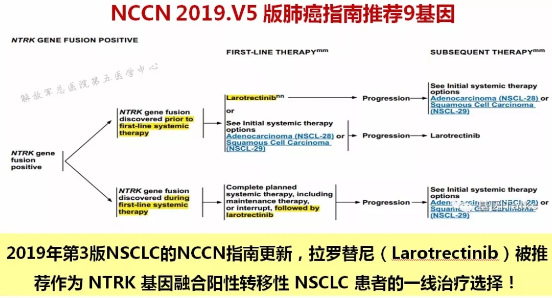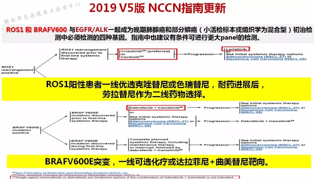 ROS1是NSCLC的重要驱动基因,Profile 1001、1201研究证实克唑替尼对ROS 1靶点的效果[3~4];韩国的一项小样本量提示色瑞替尼对ROS1的有效性,该研究显示,在28例可评估的克唑替尼未治患者中,色瑞替尼的ORR为67%,中位PFS为19.3个月[5]。在2019 V5版NCCN指南中,色瑞替尼一线治疗获得NCCN推荐,ROS1阳性患者一线优选克唑替尼或色瑞替尼,耐药进展后二线靶向药物选择有劳拉替尼。