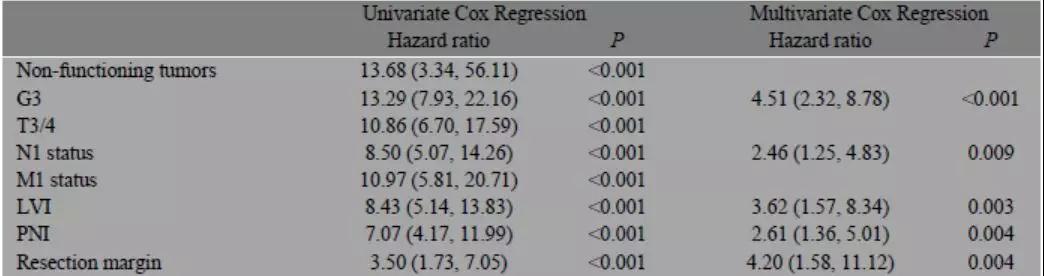 结果:总体来说,542例患者(300例女性,55.4%)接受了胰腺神经内分泌肿瘤的手术切除,其中435例(80.3%)为非功能性肿瘤。时间-趋势分析显示,手术切除的胰腺神经内分泌肿瘤数量持续增加;然而,偶发的非功能性胰腺神经内分泌肿瘤数也随着时间的推移而增加(P<0.001)。5年和10年无病生存率分别为86.4%和81.3%。总复发率为13.7%,最常见的复发部位是肝脏。初次手术后复发的中位时间为19.0月(范围0.8-236.3),复发后的中位生存时间为22.6月(范围0.4-126.9)。多因素回归分析显示,G3级胰腺神经内分泌肿瘤(风险比4.51; P<0.001)、淋巴结转移(风险比2.46; P=0.009)、淋巴血管侵犯(风险比3.62; P=0.004),周围神经侵犯(风险比 2.61;P=0.004)和手术切缘阳性(风险比4.20;P=0.003)是影响无病生存期的独立预测因子。