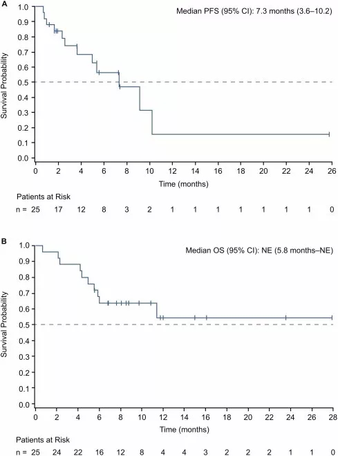 研究共筛选了536例患者,其中25例携带RET重排(与KIF5B和CCDC6重排的患者分别有13例和12例)。总体ORR为16% (95% CI: 4.5%–36.1%),中位PFS为7.3个月,中位OS及反应持续时间尚未达到。