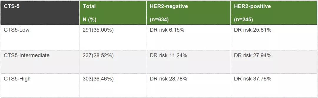 在HER2阴性数据中,随诊的2002-2009年634例HER2阴性队列的CTS5危险分层定义为5~10年内观察到的DR率为6.15%的低风险队列,观察到的DR率为11.24%的中等风险队列和28.78%的高风险队列。CTS5将HER2阴性队列分为3个不同的危险组,观察到的DR高于ATAC/BIG1-98试验,然而,HER2阳性队列的评估预测远期复发准确率较HER2阴性队列的评估预测远期复发转移率准确度低。在HER2阳性队列中,低、中、高组的DR率分别为25.81%、27.94%和37.76%。从第5年到第10年,63%的淋巴结阴性患者为低风险患者,DR率为5.7%(14/245)。
