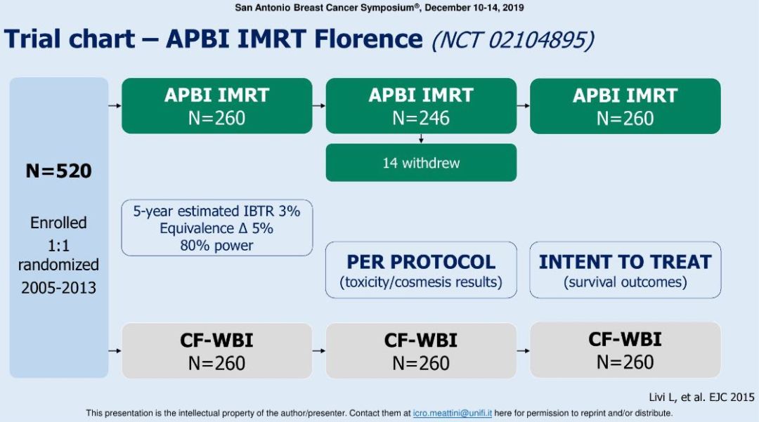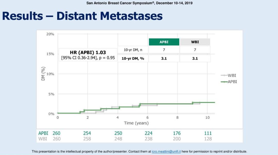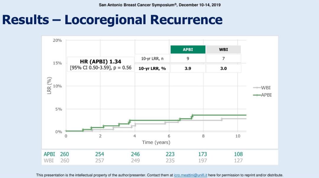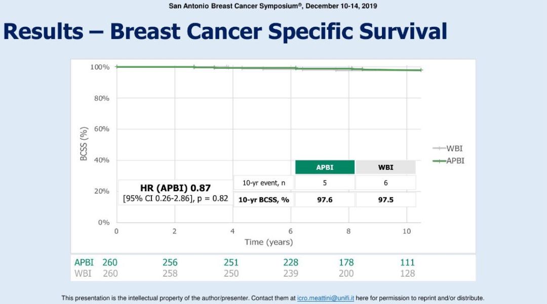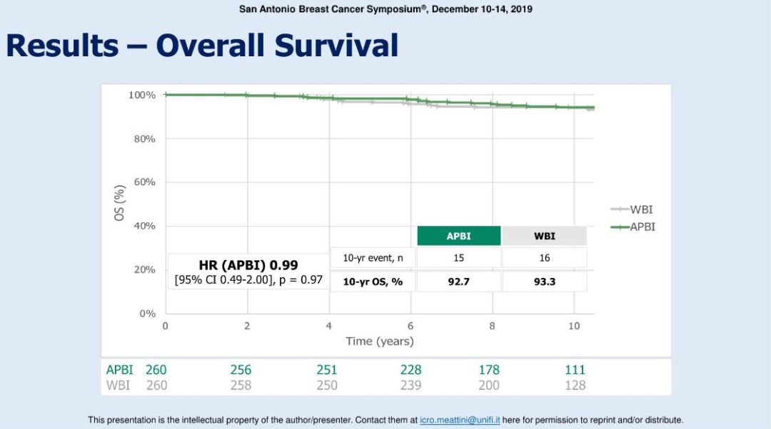 这项来自佛罗里达大学的APBI研究(APBI-IMRT-Florence),是全球首个应用调强适形放射治疗(IMRT)技术实施APBI的随机对照III期临床研究。本研究的5年随访结果曾在2014年的SABCS大会上报告,且于2015年全文发表于欧洲肿瘤学杂志(Eur J Cancer. 2015 Mar;51(4):451-63),本次更新的10年随访结果进一步确认了APBI与全乳放疗等效但低毒的结论。