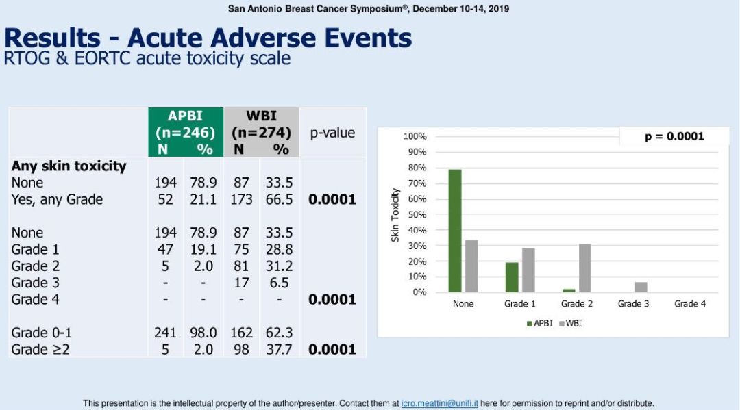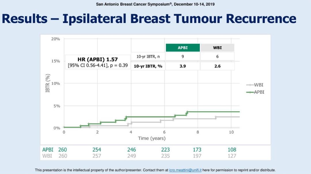 该研究的主要入组标准为:保乳术后、T<2.5cm,切缘≥5mm,年龄>40岁。共入组520例患者,随机分为APBI组(260例)和全乳放疗组(260例)。APBI组接受部分乳腺30Gy/5次/每天一次/2周照射,全乳放疗组接受全乳50Gy/25次续贯瘤床加量10Gy/5次照射。主要研究终点为同侧乳房内复发(IBTR),次要研究终点包括总生存、乳腺癌特异生存、对侧乳腺癌发生率、早期和晚期毒性反应以及医师评估美容效果。