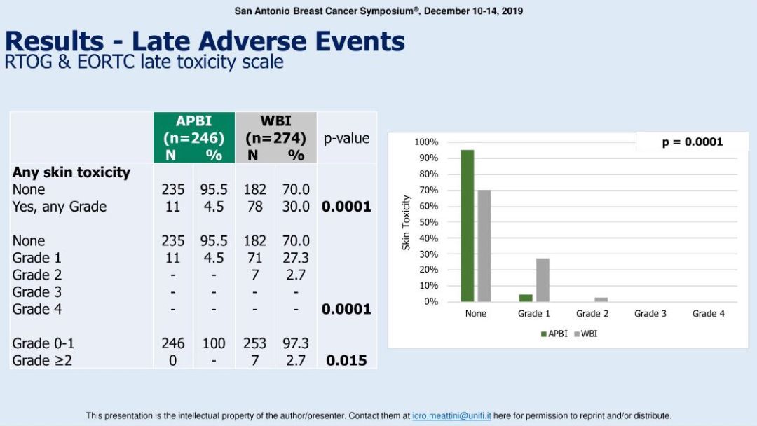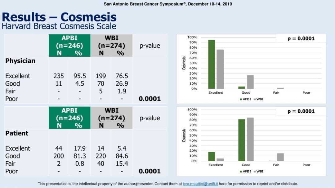 在毒副反应方面,APBI显示出了相对于全乳放疗的优势。APBI组和全乳放疗组的急性皮肤反应发生率分别为21.1%和66.5%(P=0.0001),两组的晚期皮肤反应发生率分别为4.5%和30%(P=0.0001)。APBI组的美容效果也显著优于全乳放疗组,APBI组有95.5%和4.5%的患者分别达到了优和良的医师评估美容效果,而全乳放疗组分别仅为76.%和26.9%(P=0.0001)。尽管患者评估美容效果终点要明显差于医师评估美容效果,但是APBI组仍显著优于全乳放疗组,APBI组分别有17.9%和81.3%的患者达到了优和良的美容效果,而全乳放疗组分别仅为5.4%和84.4%(P=0.0001)。