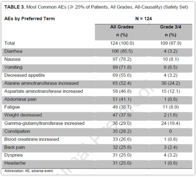 就安全性而言,塞瑞替尼的中位治疗持续时间为23.2个月,中位治疗的剂量强度为77.5%。84.7%的患者需要调减剂量或治疗中断。中位第一次调低剂量的时间为1.9个月。14.5%的患者因不良反应导致治疗终止。最常见的不良反应包括腹泻(85.5%)、恶心(78.2%)、呕吐(71.8%)、食欲降低(55.6%)及谷丙转氨酶升高(52.4%)。3度及以上治疗相关的不良反应发生率为65.3%,其中最常见的不良反应为谷丙转氨酶升高(20.2%)和γ-GT升高(16.1%)。(图4)