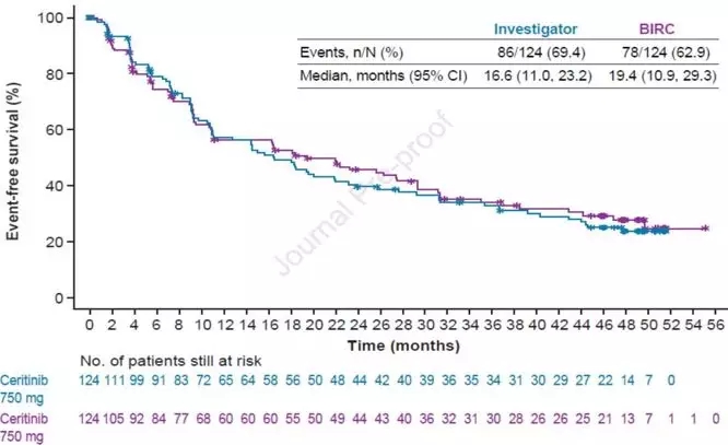 这是一项多中心、开放标签的单臂II期临床研究,患者年龄≥18周岁,既往治疗接受化疗线数≤3线,但不能接受过ALK-TKI治疗,患者PS评分0-2分且至少有1个可测量病灶。ALK重排基于荧光原位杂交的方法进行。无症状及稳定的脑转移患者允许入组。既往接受放疗的脑转移患者在入组前2周需结束放疗。符合入组标准的患者接受塞瑞替尼750mg,空腹口服,直至疾病进展、发生不可耐受的不良反应或患者撤销知情同意。如果患者出现影像学进展后,研究者认为患者可以继续从塞瑞替尼的治疗中获益,允许这款药物继续服用。研究的主要终点为研究者评估的ORR,次要终点为独立评审委员会评估的ORR,反应持续时间、至反应开始时间,DCR,PFS、OS、颅内ORR、颅内DCR及安全性。该研究采用Simon两阶段设计法,将药物无效和有效的届值分别设定为35%和50%,取α=0.05,需要入组105例患者并至少有45例患者有客观反应才能认为药物有效。