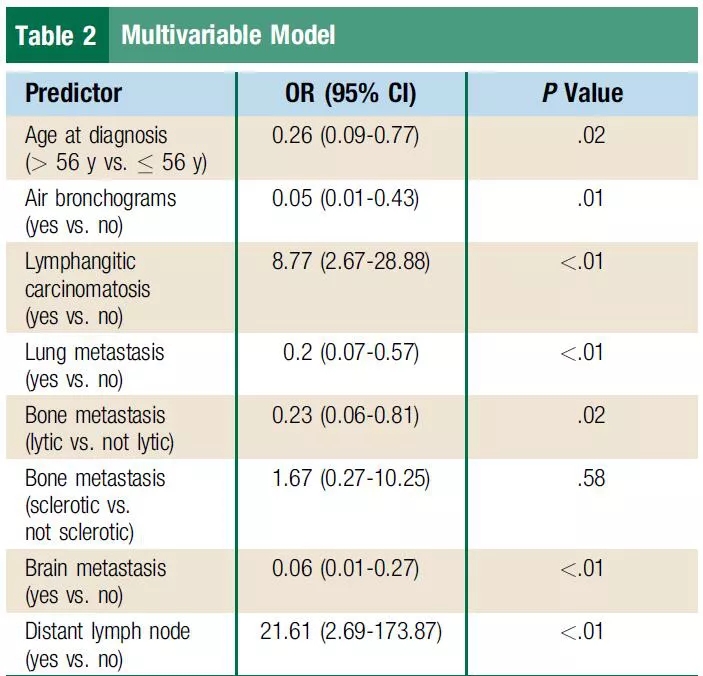 研究结论:与ALK重排或者EGFR突变相比,ROS1重排的患者胸外及脑转移比例更低,更容易出现成骨转移及远处淋巴结转移,而空气支气管征的比例较低。