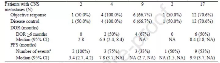 17例患者存在中枢神经系统转移,独立评审委员会评估的ORR和DCR分别为70.6%和88.6%,40 mg、80 mg、160 mg及240 mg的ORR分别为50.0% (1/2), 100.0% (4/4)、66.7% (6/9)和50.0% (1/2),中位反应持续时间和PFS分别为8.4个月和9.9个月(图4)。