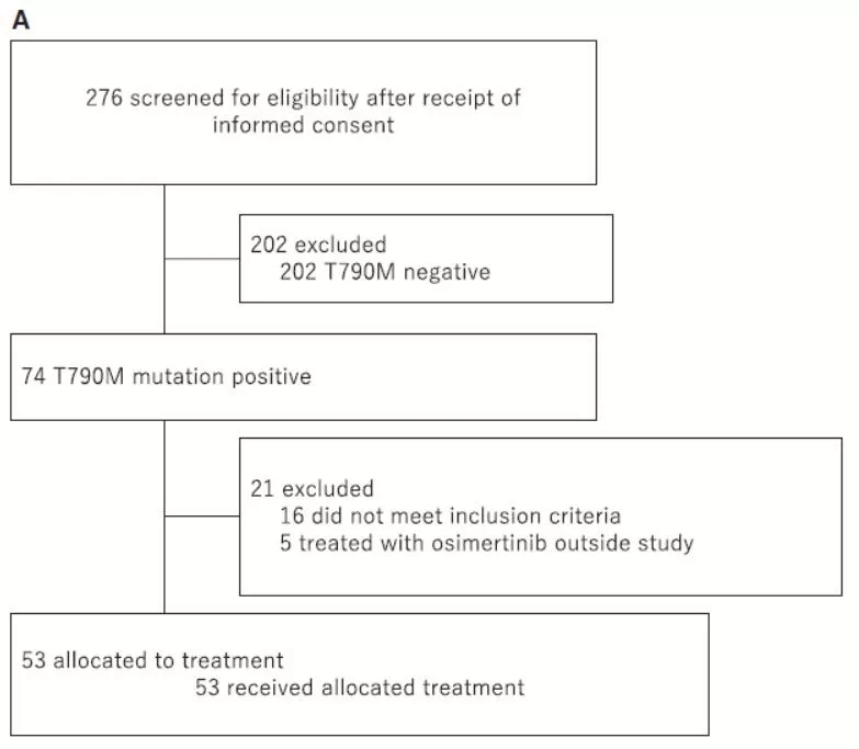 自2016年6月至2017年11月,来自日本22家中心的共计276例患者接受筛选,74例(26.8%)的患者T790M突变阳性,其中53例患者接受奥希替尼治疗,患者入组流程如图5。